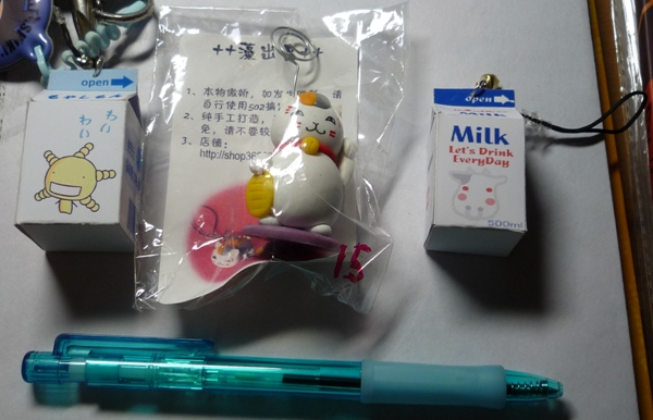 两个纸膜的小小牛奶屋挂件,以及一个软陶的娘可sensei.下面的圆珠笔是普通长度,用来作大小对比的.很可爱的萌菌挂件和仿牛奶挂件
